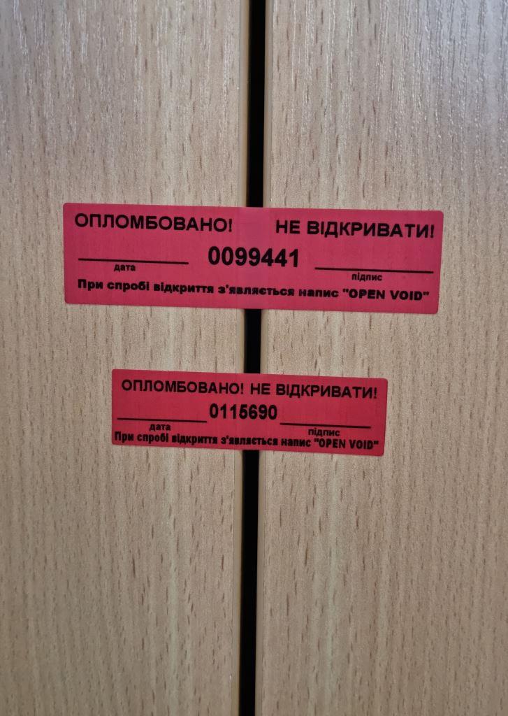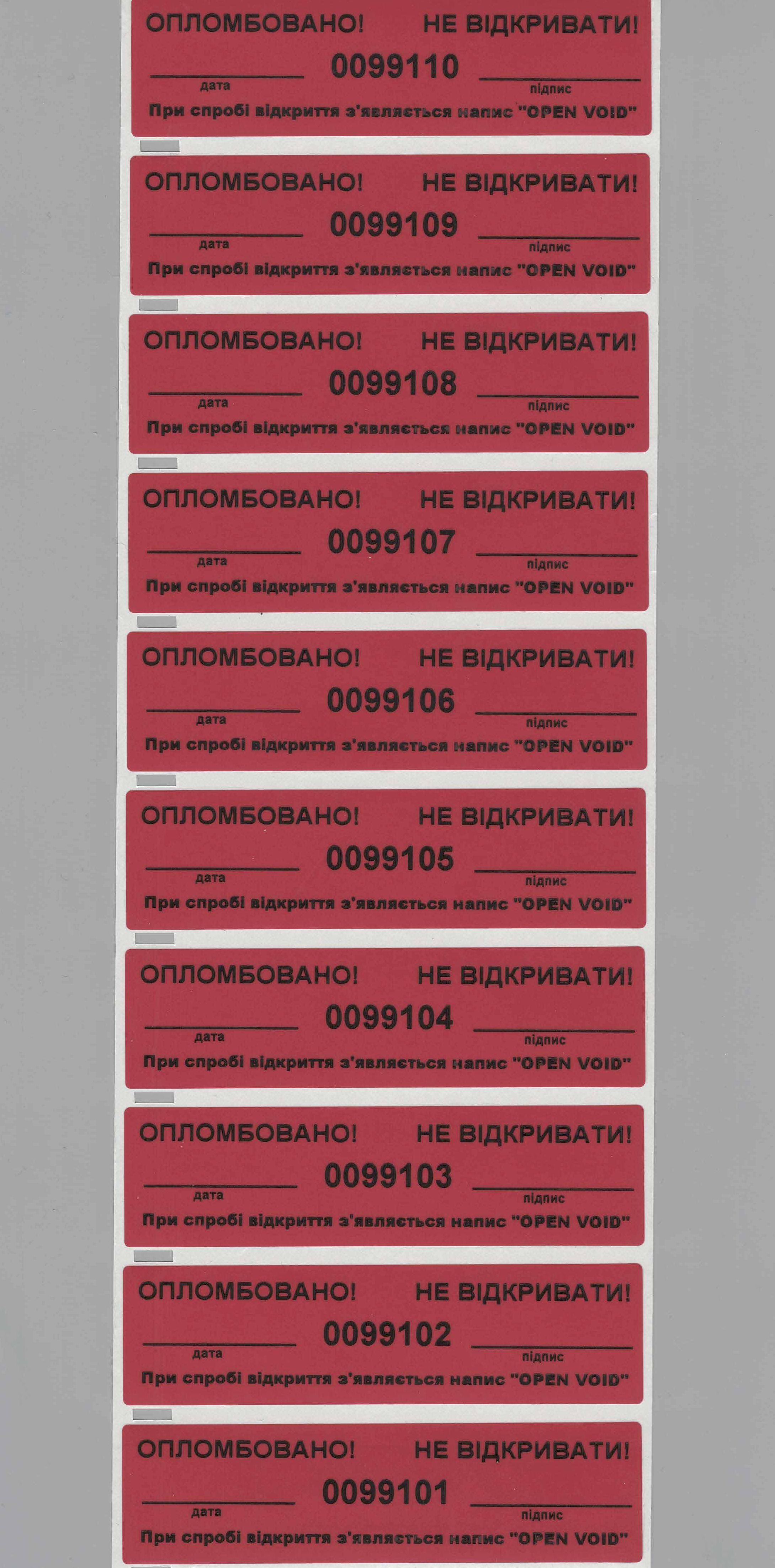 Специальная технология изготовления материала пломбы-наклейки делает невозможным ее вскрытие без видимых следов. При отклеивании на пломбе-наклейке появляется надпись (OPEN VOID).